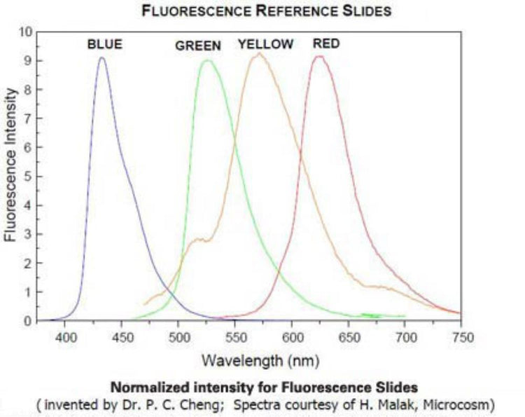 The full fluorescent reference set contains four slides with spectra approximating the most commonly used fluorophores: