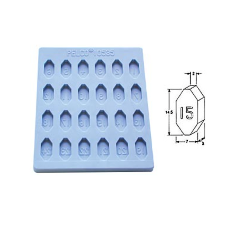 - 24 cavities: Double pretrimmed double ends, consecutive numbering (1-24), blue silicone rubber. Mould size: 67 x 85 x 7mm thick.