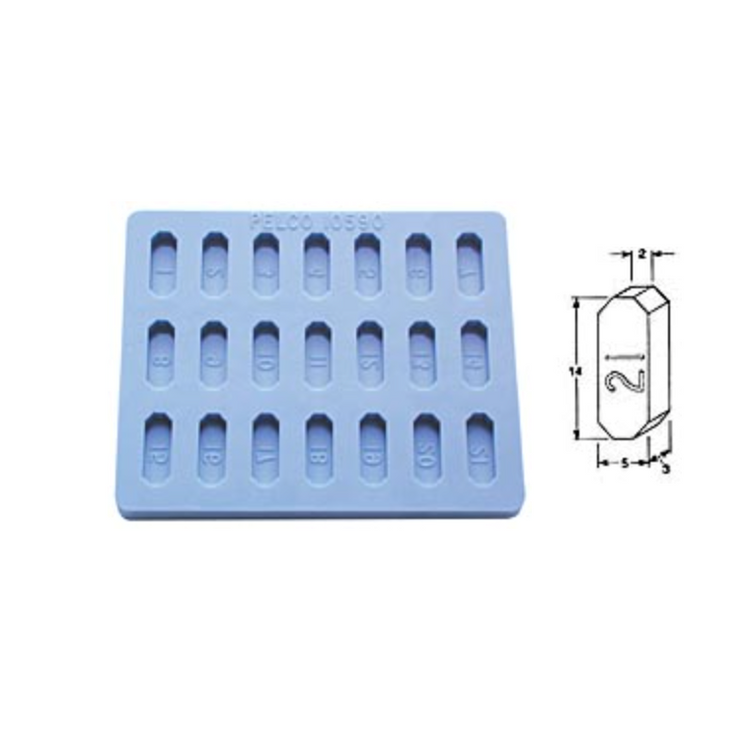 - 21 cavities: Double pretrimmed ends, consecutive numbering (1-21), blue silicone rubber. Mould size: 72 x 62 x 6mm thick.