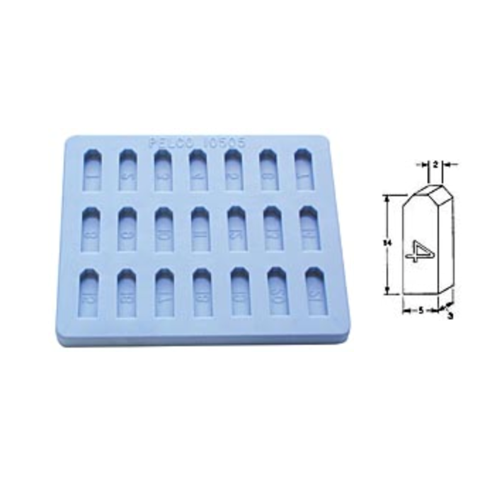 - 20 cavities: Consecutive numbering (1-20), pretrimmed end, blue silicone rubber. Mould size: 89 x 76 x 7mm thick.