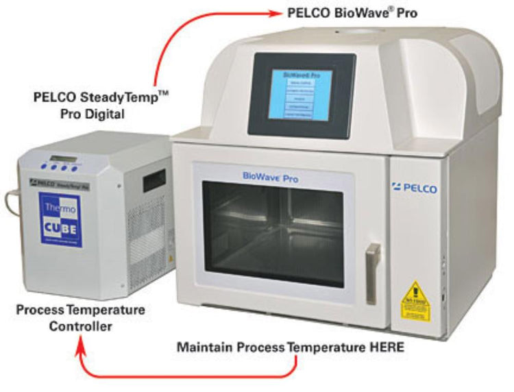 The PELCO SteadyTemp Pro Digital provides precise, fully automatic temperature control for a variety of microwave processing applications, such as the Formaldehyde Fixation and EDTA Decalcification Application Kit and the Confocal Microscopy and In Situ Hybridisation Application Kit, using the PELCO ColdSpot Pro. Sample temperature control, with Pro Digital, is set and monitored via the touch screen on the new PELCO BioWave Pro, tissue processing system. The controls of the PELCO SteadyTemp Digital Plus are fully integrated with the PELCO BioWave Pro System. The ability to control sample temperature, in this manner, is unique and can provide continuous working temperatures above or below ambient from 5-80°C via 400W of cooling and 600W of heating capacity, using reliable, Freon-free thermoelectric technology.